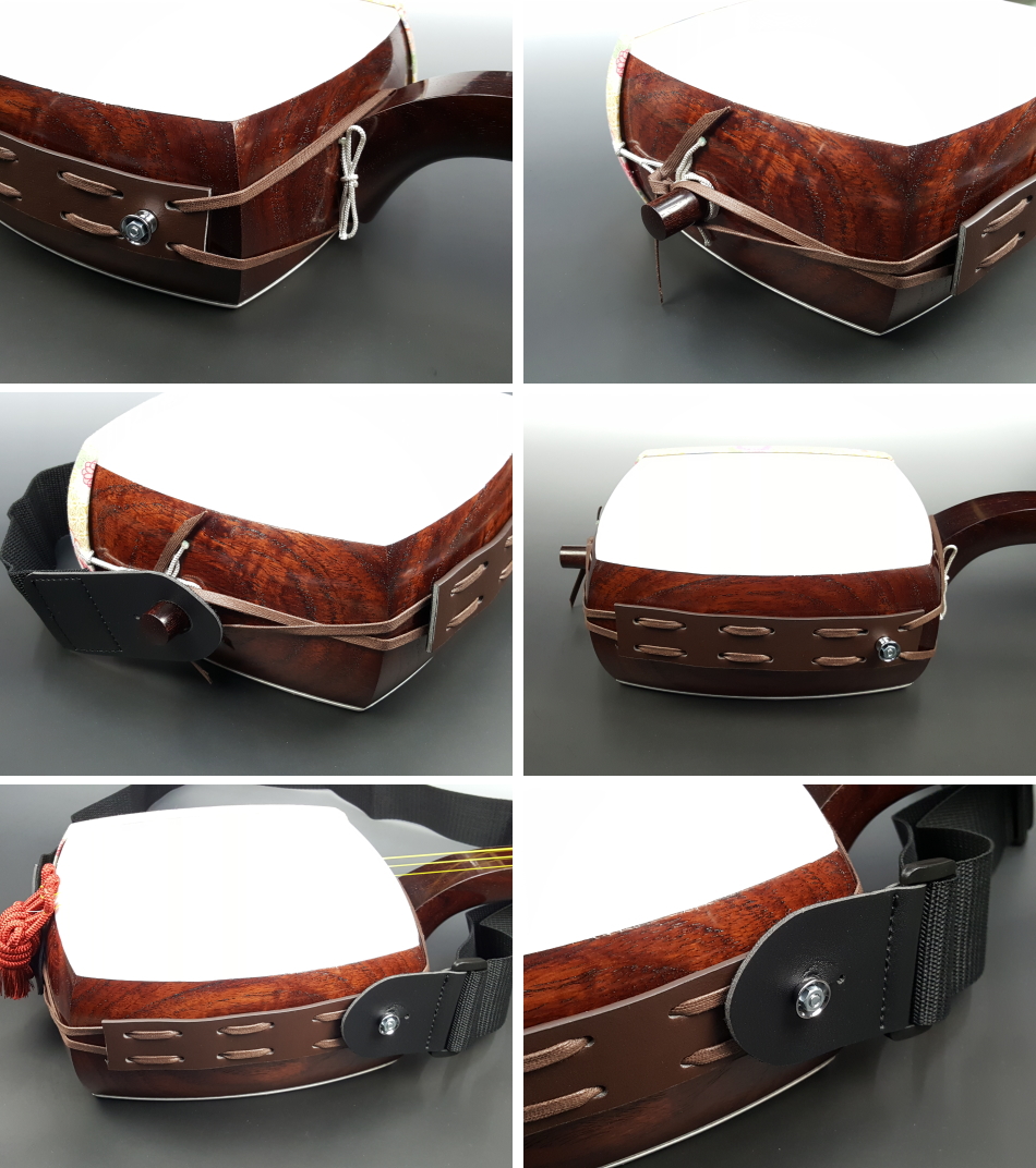 ベルト全長:140センチ 幅:5センチ ストラップ部(茶色部分):170ミリ×33ミリ お祭りなど三味線を立って弾きたい時のニーズに対応した商品です。 ◆エンドピンが付いた茶色の部分がストラップ部です。 合皮ラミネート革とロー引き紐で安定化を図っています。 【特色】 ・三味線を傷つけることなくストラップが取り付け可能。 ・お祭りなどで大活躍。 ・取付簡単。 【取付の際の注意点】 @中木(りんどう金具)に取付ける祭は緩みの無いよう、紐を引っ張って取付けて下さい。 A中木(りんどう金具)に取付ける際の結び方は必ずコマ結びをして下さい。他の結び方では緩みの原因になります。 B胴掛けを外して、本製品を先に取付けて下さい。緩みを防止するためです。 |