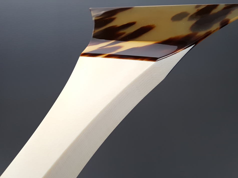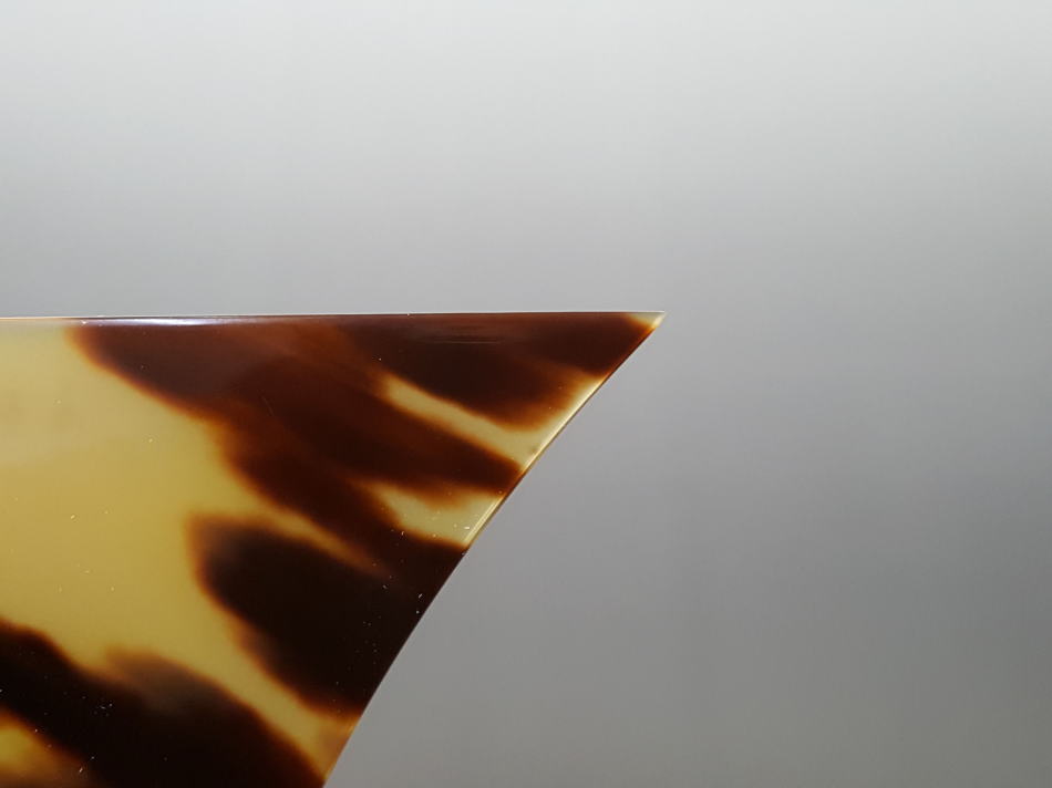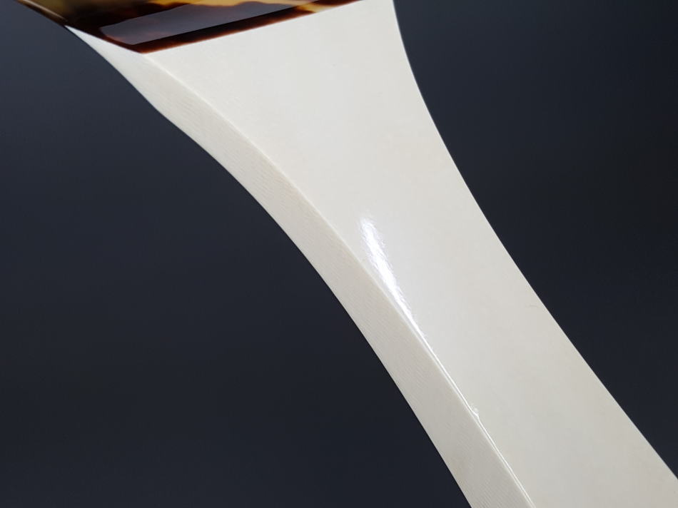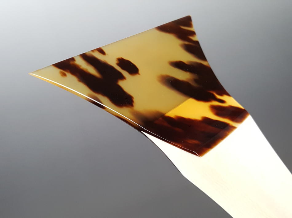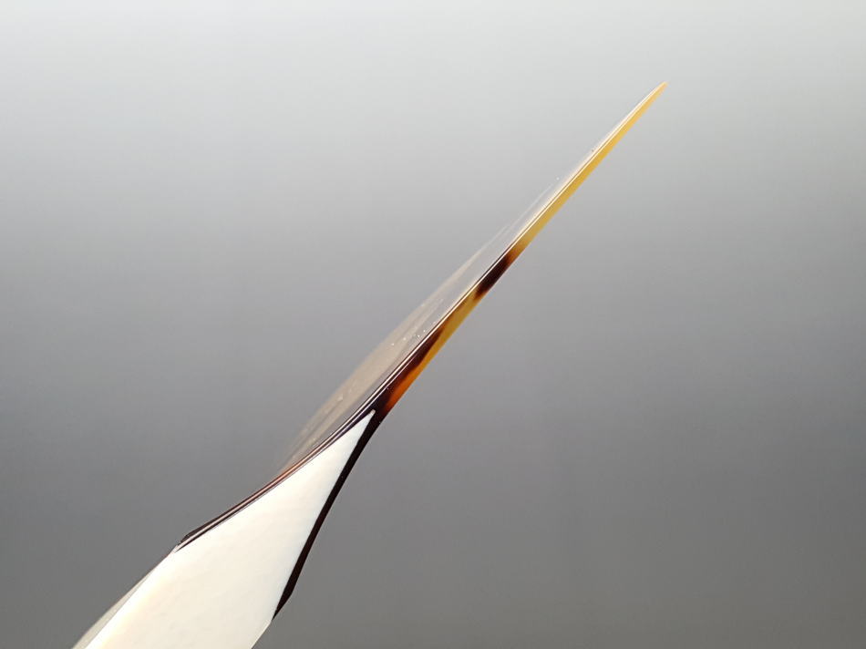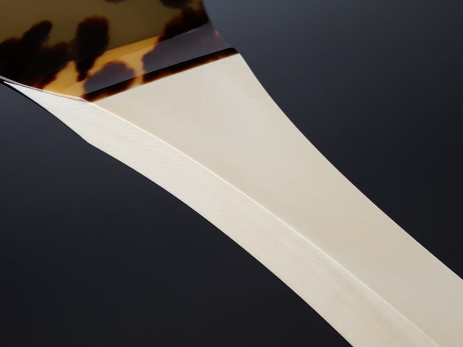 〔材質〕 本鼈甲(一枚物) 〔寸法〕 開き:134o 全長:237o 重さ:193g 才尻:25o×25o 撥先のしなり:軟い 手元・象牙台 ※上質な象牙台に鼈甲を組み合わせた高級品になります。象牙台は手に馴染みやすいので、大変握りやすく弾き易いです。 今では滅多にお目にかかれない極上の鼈甲に、筋目の少ない上質な象牙を組み合わせてあります。 年々鼈甲の数が減少し、現在ではメーカーですら新たに鼈甲を入手するのが非常に困難になっており、中古品としても滅多に入手できません。 手元の象牙台は筋目も少なく、新品同様の艶があり、すごく綺麗です。七八サイズの中でも手元が細く、重さもその分軽いので、手の小さい方や、通常の七八サイズでは重すぎると感じられる方にお勧めの撥でございます。 こちらの撥は現在小売店店頭であれば新品約80万円前後が相場です。 ![]() |
