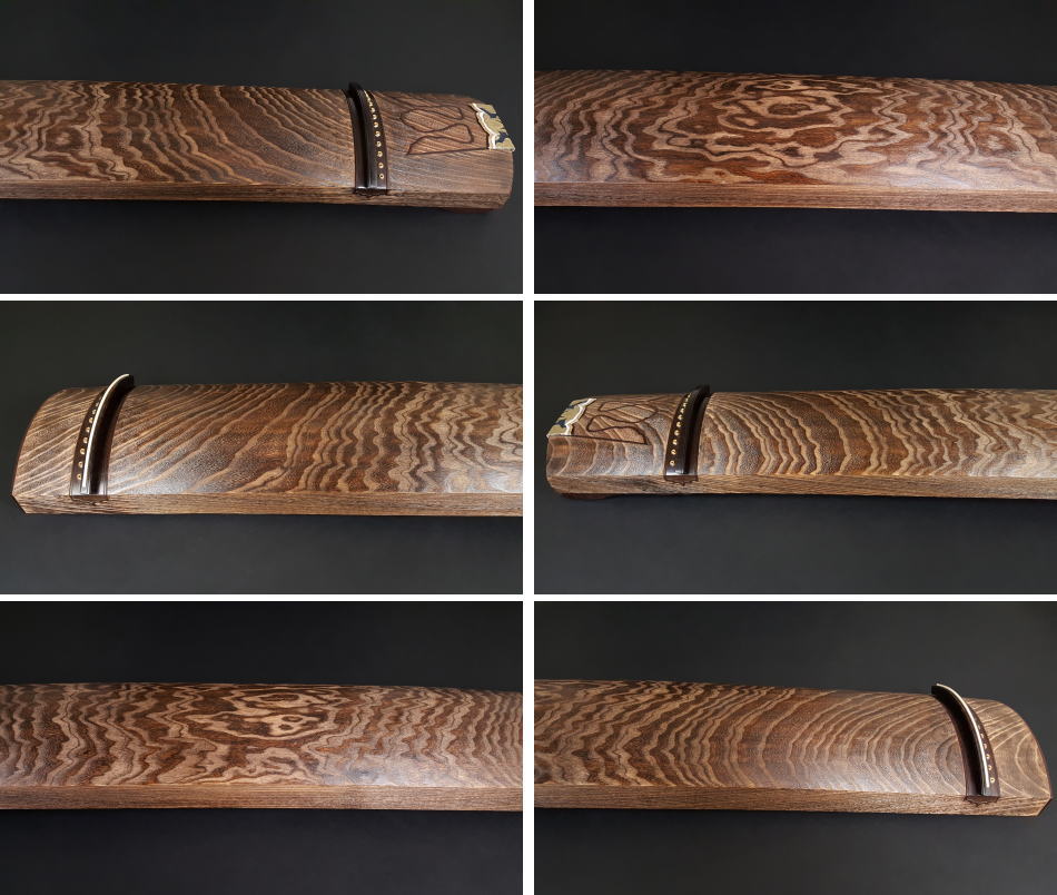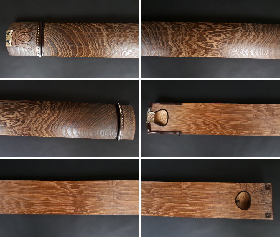 くり甲琴の中でも新品で購入するとなると150万円以上クラスのお琴になります。木目も多く、密度が高いので特徴です。甲と磯の部分を色合わせ程度に焼き直ししておりますので、甲と磯には傷一つございません。見た目は新品のようです。装飾は紅木材を使用した玉縁巻きになっており、装飾の部分の色褪せなどは殆ど見られません。木の質は柔くもなく堅くもなくといった感じですので、幅広い方にご使用頂けることと思います。裏板にも木目の綺麗な柾板を使用し、甲の裏には綾杉彫を施してあります。