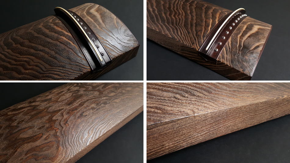 装飾は紅木材を使用した玉縁巻きになっており、装飾の部分の色褪せなどは殆ど見られません。木の質は柔くもなく堅くもなくといった感じですので、幅広い方にご使用頂けることと思います。