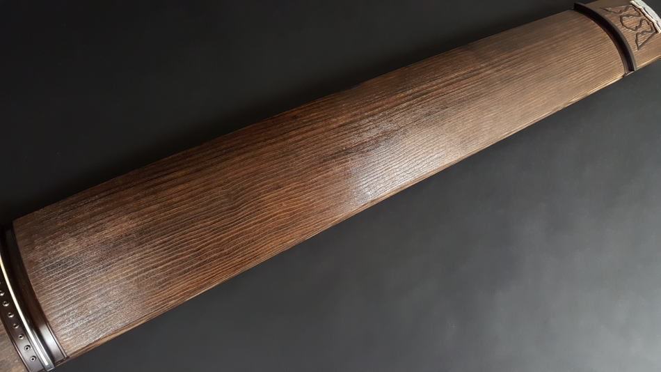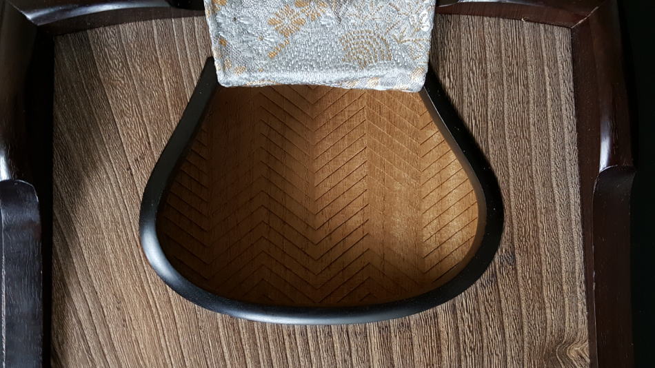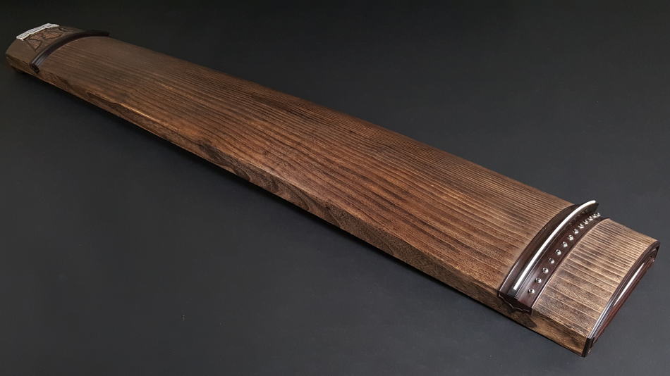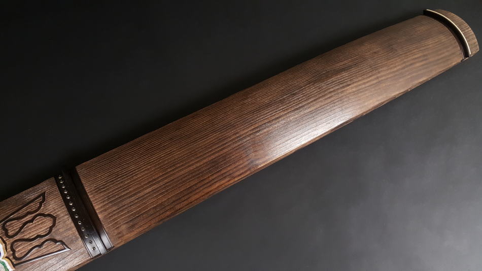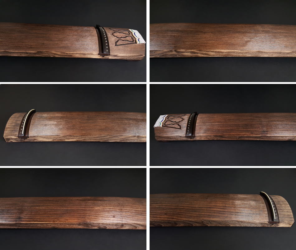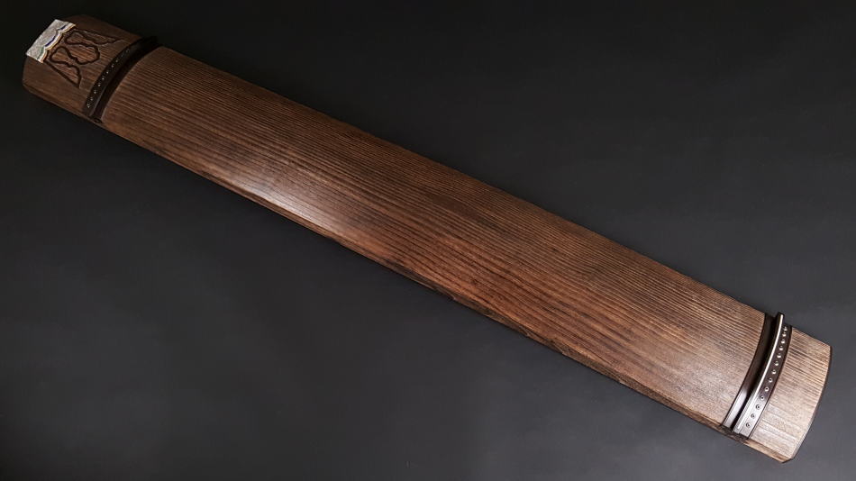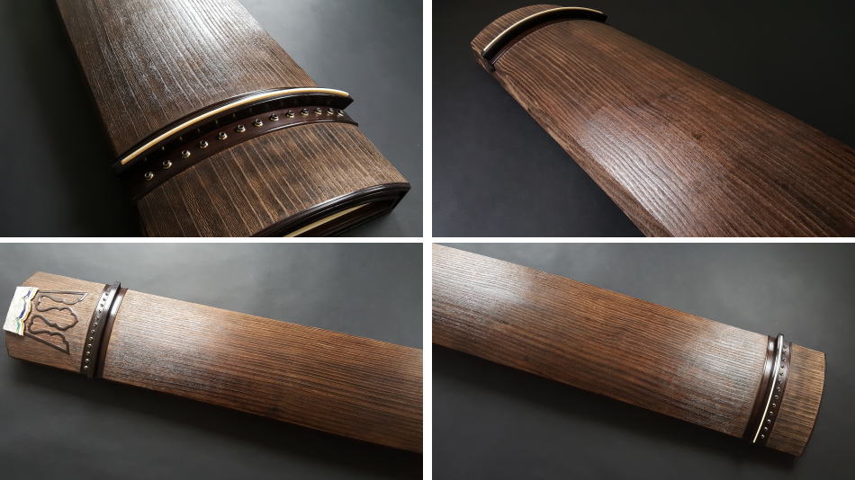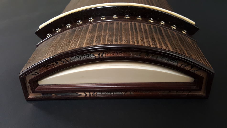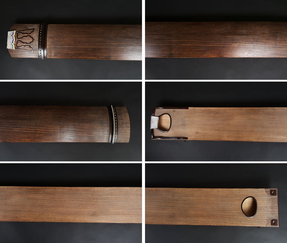 柾目杢の最高級品になりますので、新品で購入するとなると200万円クラスのお琴になります。装飾には紅木材をしており、装飾の部分の色褪せなどは殆ど見られません。甲と磯の部分を色合わせ程度に焼き直ししておりますので、甲と磯には傷一つございません。見た目は新品のようです。裏板にも木目の綺麗な柾板を使用し、甲の裏には子持ち綾杉彫を施してあります。
