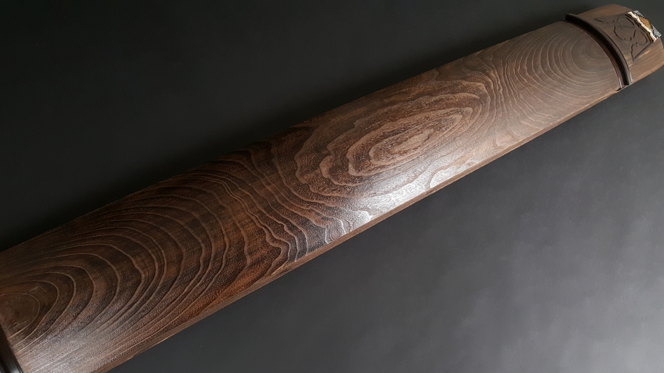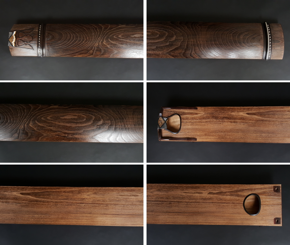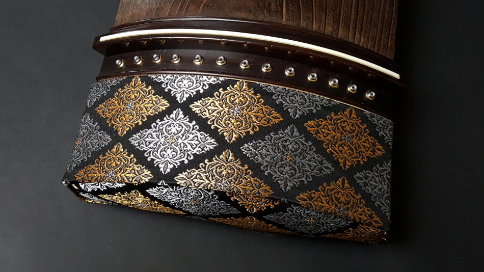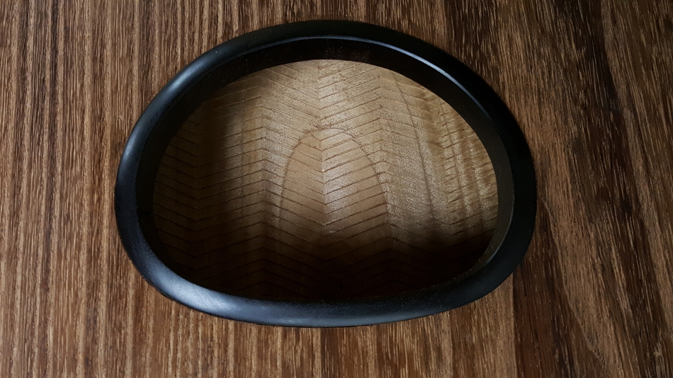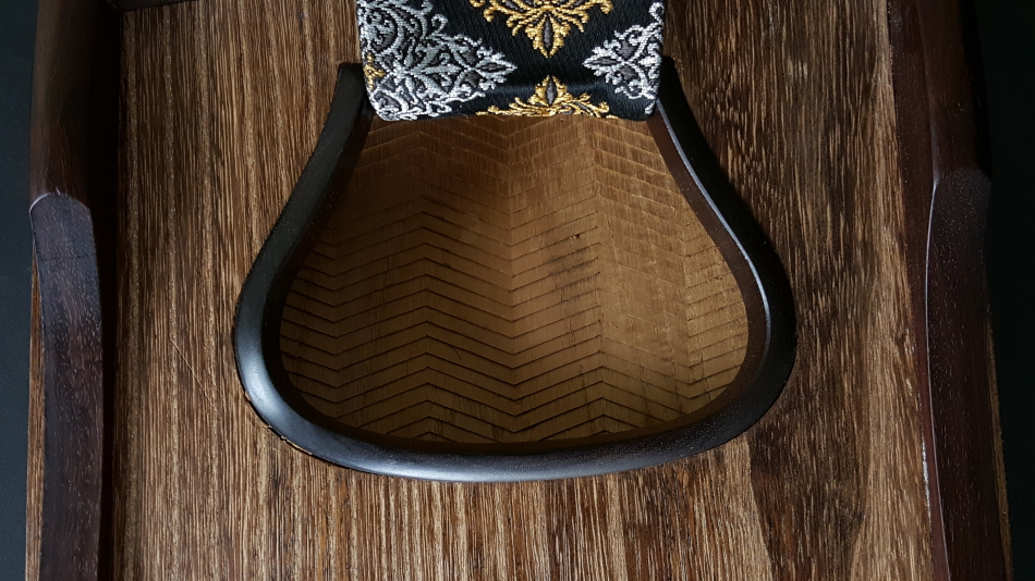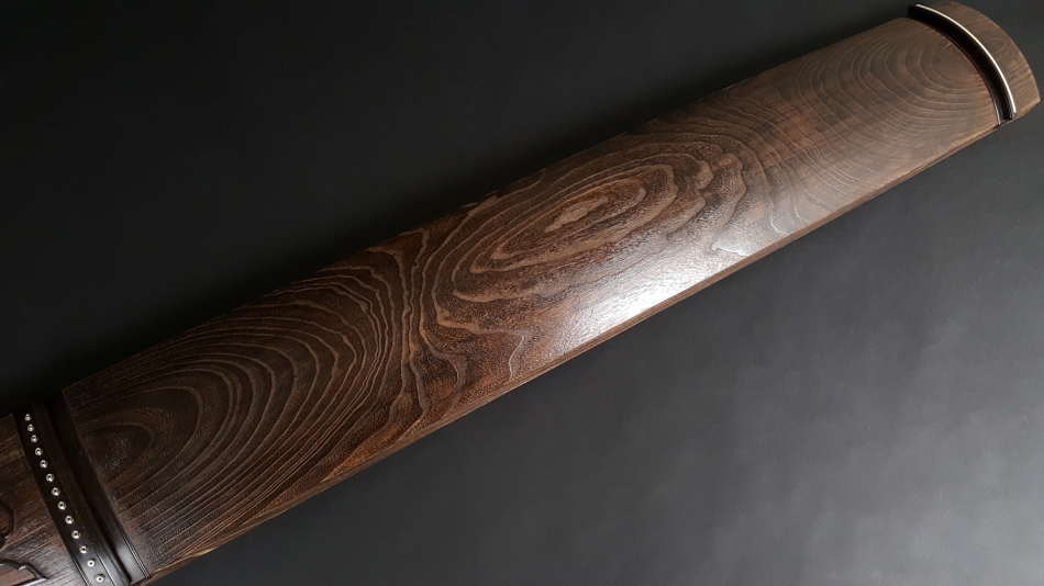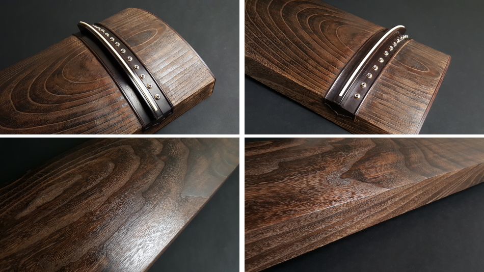装飾は紅木材を使用した玉縁巻きになっており、装飾の部分の色褪せなどは殆ど見られません。全体的に綺麗です。木の質も柔くもなく、堅くもなく、といった感じですので、幅広い方にご使用いただけるのではないでしょうか。甲の裏には綾杉彫を施してあります。