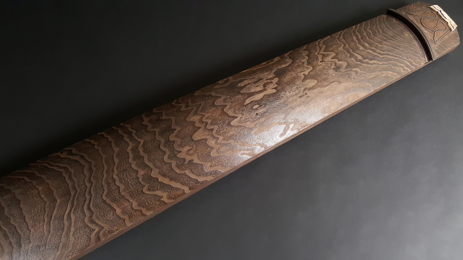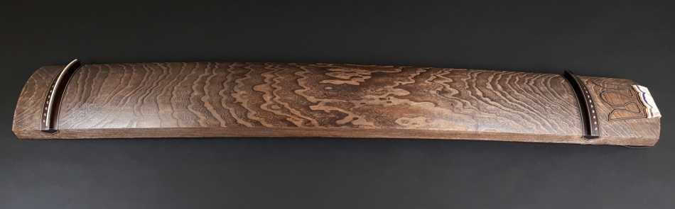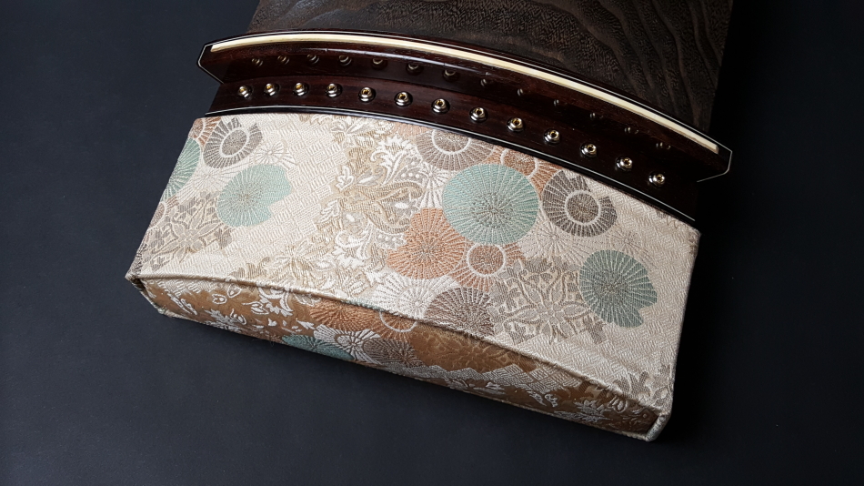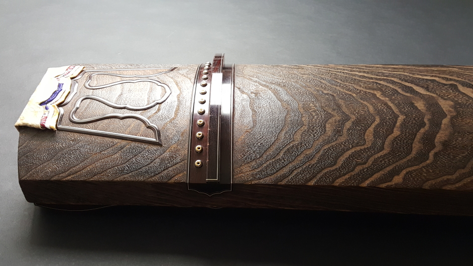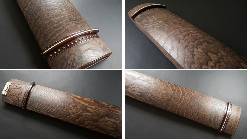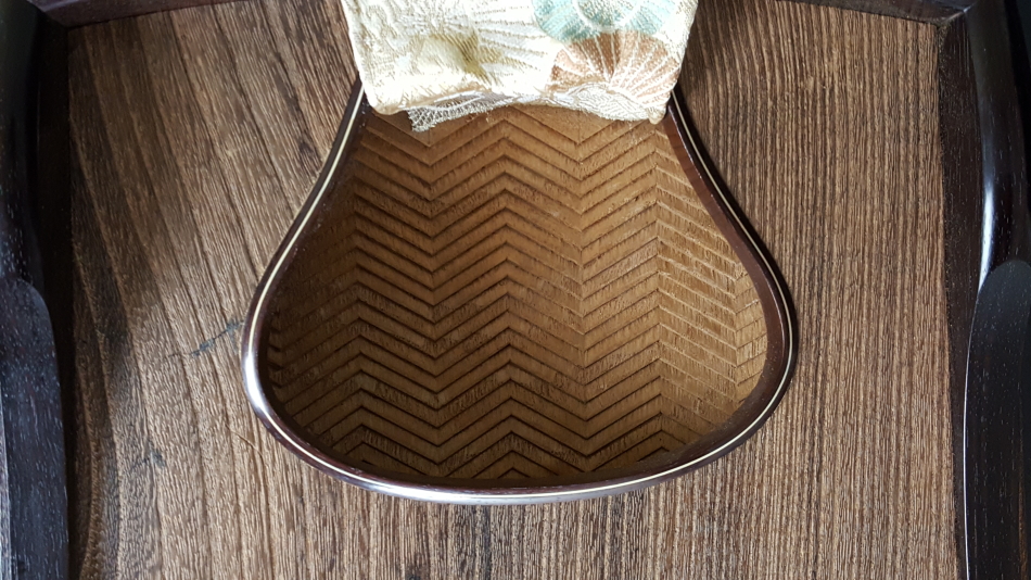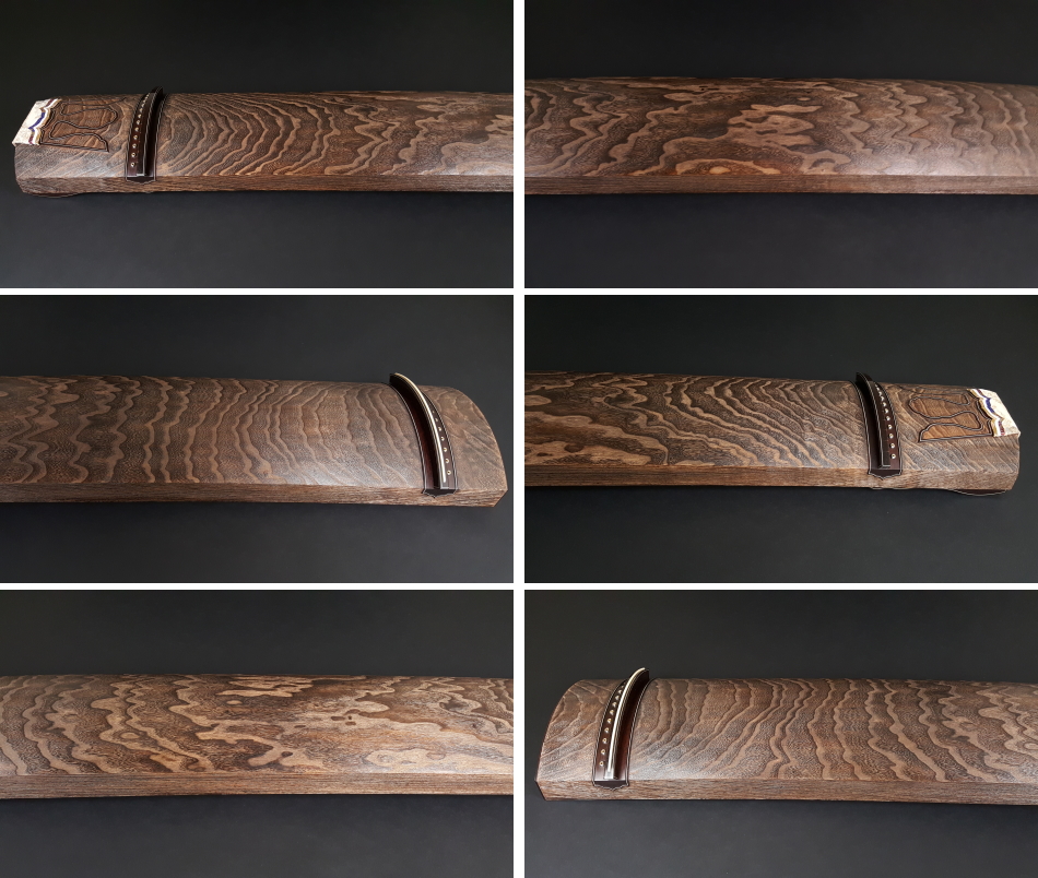 甲と磯の部分を色合わせ程度に焼き直ししておりますので、甲と磯には傷一つございません。見た目は新品のようです。装飾は紅木材を使用した玉縁巻きになっており、装飾の部分の色褪せなどは殆ど見られません。木の質も柔くもなく、堅くもなく、といった感じですので、幅広い方にご使用いただけるのではないでしょうか。甲の裏には綾杉彫を施してあります。