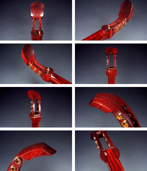 師範モデルの津軽金細三味線です。 現在師範の方、師範を目指している方、「先生と同じ品質の三味線で弾いてみたい」とお思いの方にお勧めの金細三味線になります。 師範というお立場になると演奏、楽器などすべての面において注目されるようになりますので、最低でもこのクラスの三味線をお持ちいただくことを弊社ではお勧めしております。 「先生のような三味線で演奏をしたい」とお思いの方も少なくありません。腕前以上の楽器を持つことに気が引ける方が実際には多いですが、腕前以上の楽器を持つということは決していけないことではありません。逆に良い音色の楽器で演奏をした方が音が鮮明な為、つぼが少しでもずれれば、はっきりと音に現れる為、正確につぼが押せるようになり上達が早いと言われています。また、良い楽器を持つようになると練習も楽しくすごく捗られるようになります。そのような方にもお勧めの三味線です。 こちらの三味線の特長は細目のトチが棹の70%程入っており、このクラスでは非常に堅く、目が細かいです。木が堅いほど三味線の音色は前面に響きますので非常に気持ちよく演奏が楽しめます。木の色は赤いです。 胴は棹に最適な高級花林材をバランスよく組み合わせ、棹の継ぎ目は安定度を増すために二枚溝にし、金を埋め込み仕上げました。 糸巻きは紅木本黒檀、クリスタル、象牙調の3種類からお選びください。皮はご注文後に厳選された極上犬皮を張り上げ、最高の状態でお客様にお届けいたします。 和楽器市場では大量に皮を仕入れ、その中から良質の皮を厳選し、長年の経験で技術を培ってきた職人が丹精込めて手張りで皮を張り上げております。三味線とは皮の張りが足りなければ、いくら良い三味線でも音が鳴りません。しかし皮の張りが確りしていれば、驚くほど良く鳴るものです。国内最高レベルの皮張り技術で三味線の音色を最大限引き出します。 ご購入後、実際手にとって演奏して頂ければ品質・音質・仕上がりの良さにご満足いただけることと思います。 【三味線は購入した後が大事】 三味線は消耗品でもありますので、長くご使用いただいていると、糸巻きが消耗して緩みやすくなったり、皮張替えが必要になったりと何れは修理などが必要になる時が訪れます。弊社ではご購入後のアフターフォローも万全を期しておりますので、「売って終わり」ではなく、修理などもお安くさせていただき、ご使用いただいていく上でのご質問やご相談など責任をもってサポートをさせていただき、お客様とは長いお付き合いをさせていただきたいと思っております。 お客さまの声ページに弊社でご購入いただきましたお客様のご感想を掲載いたしておりますのご覧くださいませ。 ※お客様へ 三味線をご購入いただきましたお客様からのご感想メールをお待ちいたしております。宜しくお願いいたします。 ※弊社が使用している紅木材の詳細や三味線の知識について。 ※下記の棹の写真はすべて商品番号 WKT-5215Kの現物の写真です。
